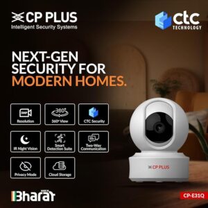 • CTC CYBER SECURE TECH FOR PRIVACY – Enhanced with CP PLUS Trusted Core Technology, this indoor Wi-Fi camera keeps your data and video streams safe from cyber threats.